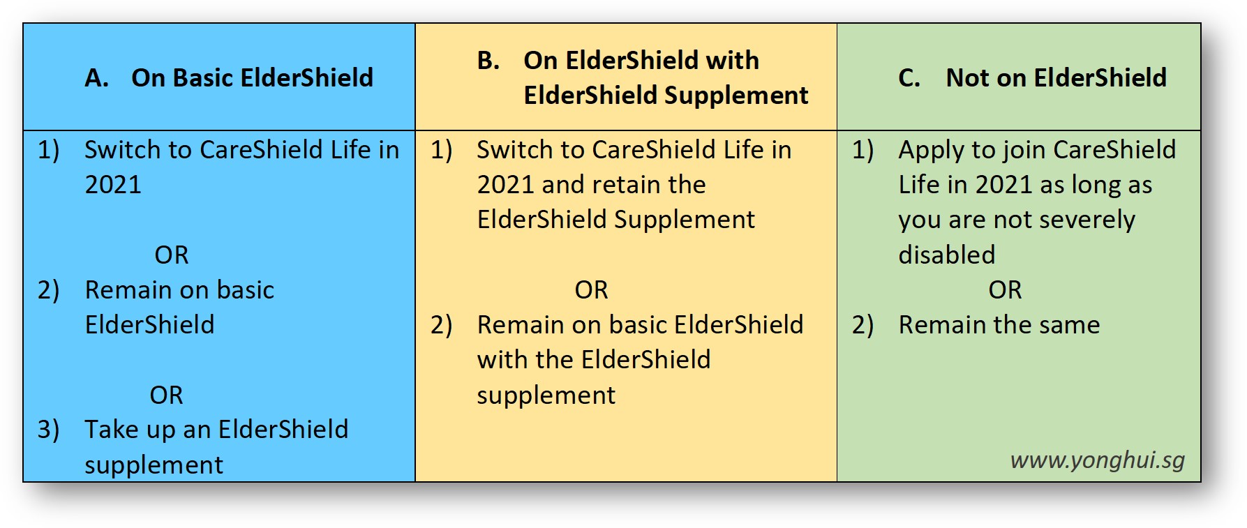 Basically, existing ElderShield policyholders will have an option to switch to CareShield Life from 2021 to get the enhanced benefits.
